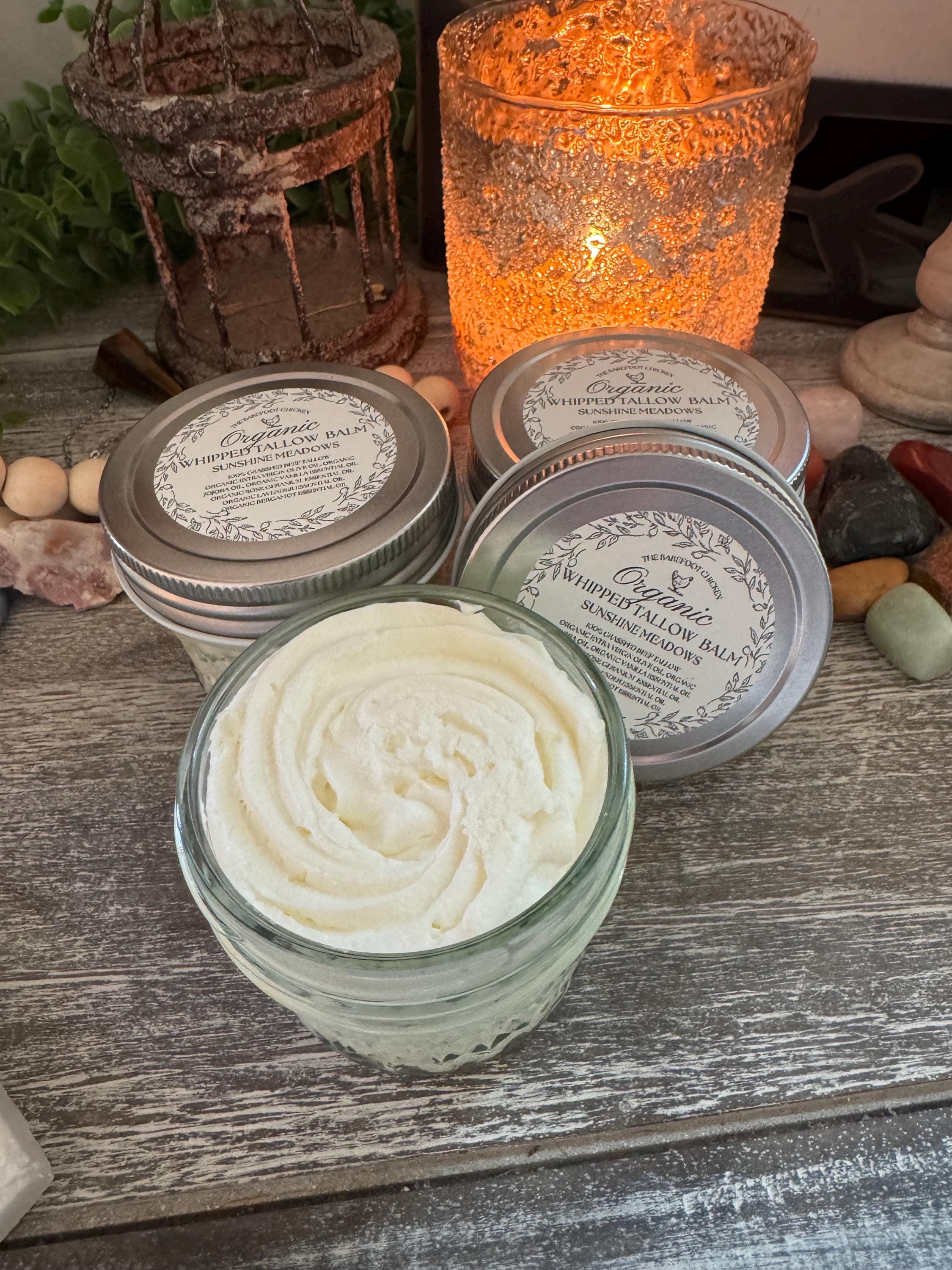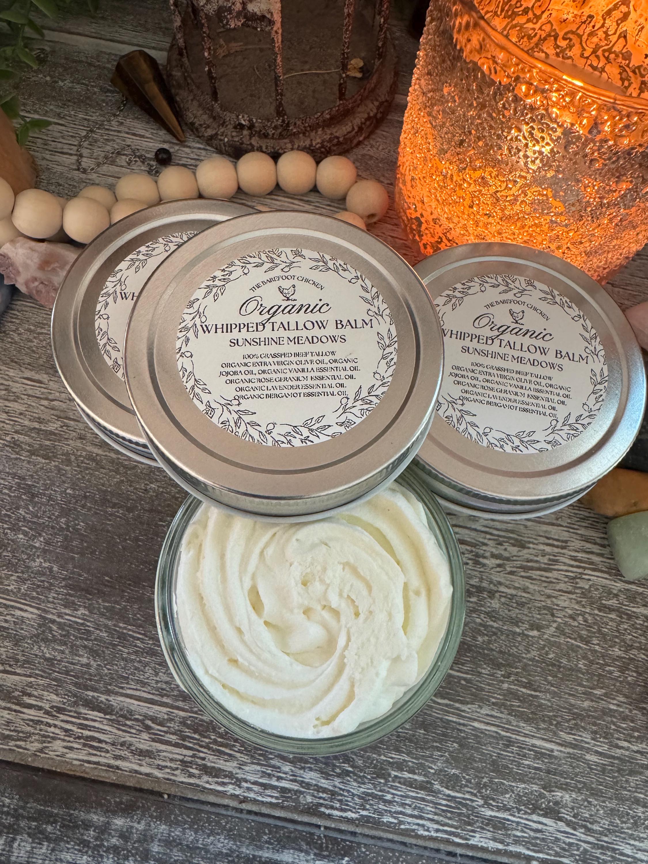 Our Sunshine Meadows 100% Grass-Fed Tallow Balm is a cheerful blend inspired by warm mornings, blooming fields, and simple outdoor joy. Handcrafted in small batches, this balm combines nutrient-rich grass-fed tallow with organic jojoba oil and organic extra virgin olive oil for deep, lasting moisture and a beautifully smooth texture with pure tallow micro pearls that give a mildly exfoliating experience that dissolves into a gloriously smooth texture.